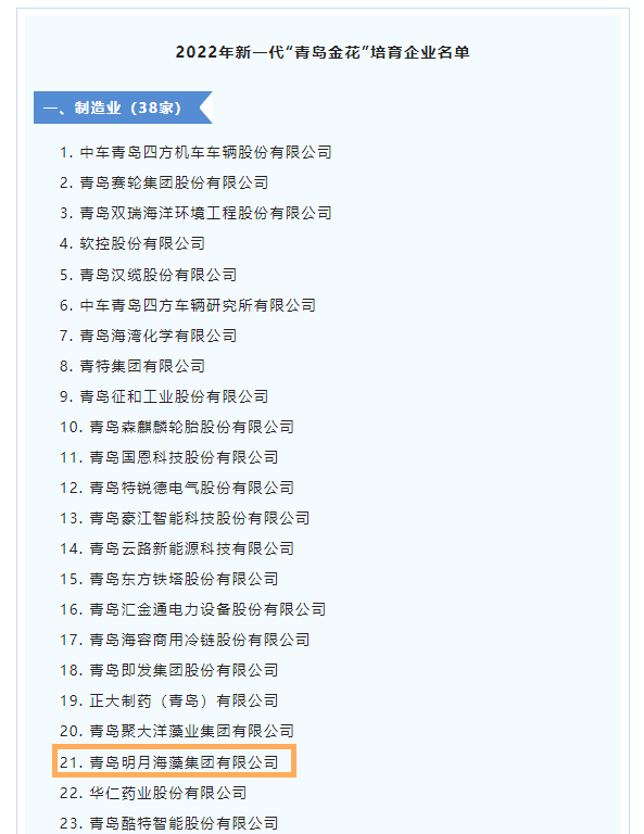 近日,從市工業(yè)和信息化局獲悉,青島明月海藻集團(tuán)榮獲2022年新一代“青島金花”培育企業(yè)稱號(hào),這是我集團(tuán)連續(xù)四年獲此殊榮。據(jù)悉,該項(xiàng)榮譽(yù)由市工業(yè)和信息化局牽頭遴選,旨在遴選一批在行業(yè)中具有明顯規(guī)模優(yōu)勢(shì)和競(jìng)爭(zhēng)優(yōu)勢(shì)、擁有高品牌知名度和品牌價(jià)值的企業(yè),充分發(fā)揮企業(yè)的品牌影響力和主體作用,促進(jìn)企業(yè)做大做強(qiáng),推進(jìn)產(chǎn)業(yè)創(chuàng)新發(fā)展。