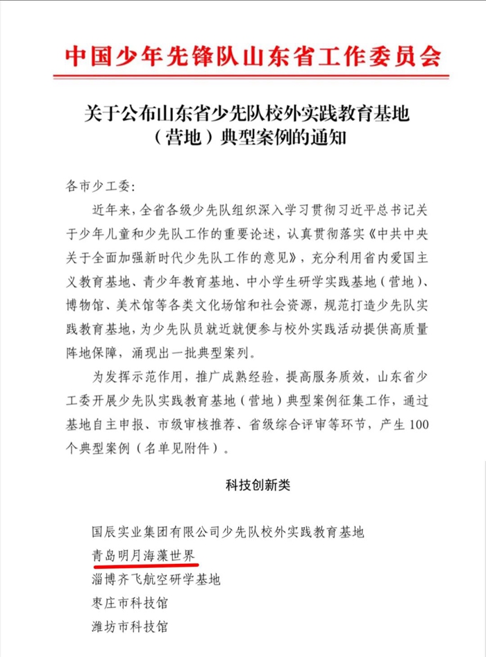 明月海藻世界獲評 “ 山東省少先隊校外實踐教育基地(營地)典型案例 ”