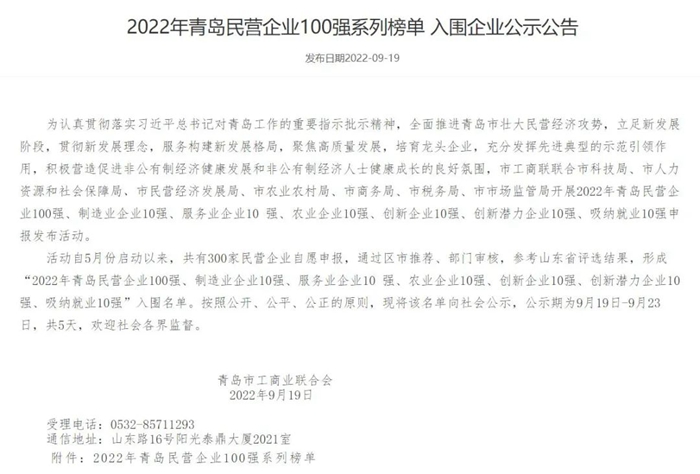 自今年5月份起,市工商聯(lián)聯(lián)合市科技局、市人力資源和社會(huì)保障局、市民營經(jīng)濟(jì)發(fā)展局、市農(nóng)業(yè)農(nóng)村局、市商務(wù)局、市稅務(wù)局、市市場監(jiān)管局開展2022年青島民營企業(yè)100強(qiáng)、制造業(yè)企業(yè)10強(qiáng)、服務(wù)業(yè)企業(yè)10強(qiáng)、農(nóng)業(yè)企業(yè)10強(qiáng)、創(chuàng)新企業(yè)10強(qiáng)、創(chuàng)新潛力企業(yè)10強(qiáng)、吸納就業(yè)10強(qiáng)申報(bào)發(fā)布活動(dòng)。