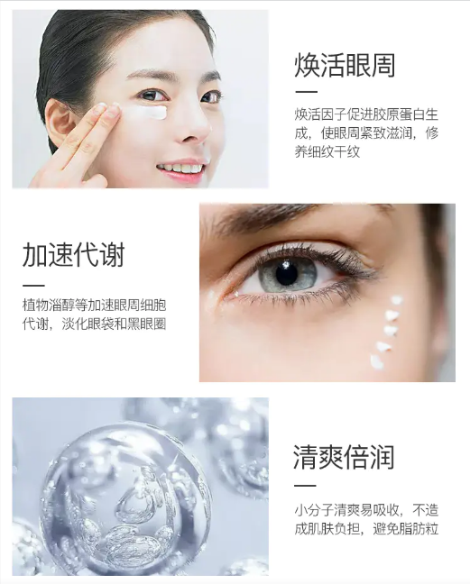 產(chǎn)品介紹:微振按摩有利于促進快速吸收,舒緩眼周,含豐富海藻彈潤精華,持潤沁透肌膚,幫助撫平眼部肌膚,充盈彈潤,煥活眼周活力。
